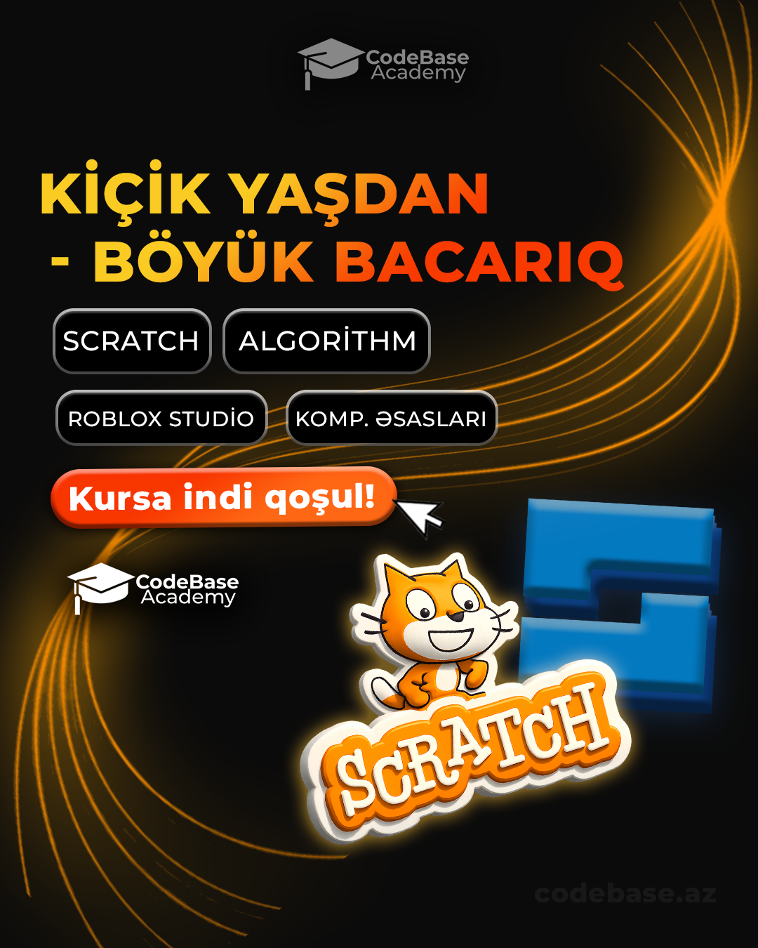 7–9 yaşlı uşaqlar üçün Scratch və Roblox Studio ilə proqramlaşdırmanın əsasları, kompüter bilikləri və alqoritmik düşüncə öyrədilən əyləncəli, interaktiv və yaradıcı kurs.